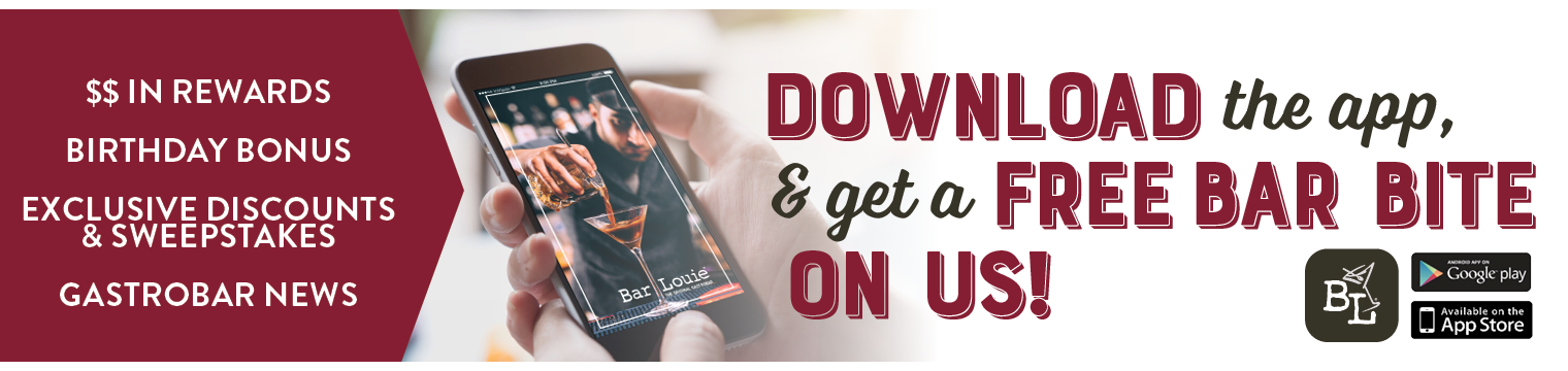 Bar Louie | The Original Gastrobar Join us Monday-Friday for your week's happiest hours! Enjoy features on all 16 oz draft beers, select premium liquors, house cocktails, all glasses of wine and of course our signature martinis. Also get 50% off select bar bites, helping you pair your favorite martini with your favorite gastrobites. FIND YOUR HAPPY HOUR FIND YOUR LOCATION