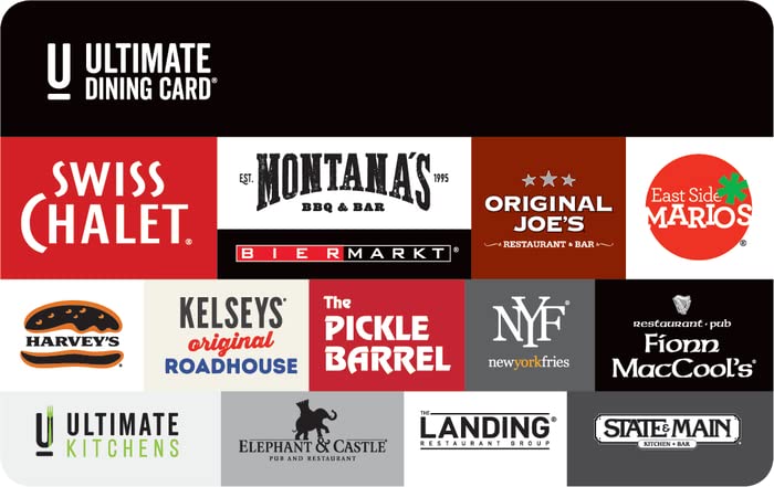 The Ultimate Dining Card. 1000+ Canadian Restaurants Ultimate Dining Card for life's Ultimate moments. Ultimate Dining Card is the gift card to use at some of Canada’s most iconic restaurants including; Swiss Chalet, Harvey's, Montana’s, Kelseys, East Side Mario's, New York Fries, Original Joe's State & Main, The Burger's Priest, The Pickle Barrel, Bier Markt, Elephant & Castle and the Landing Group of Restaurants.