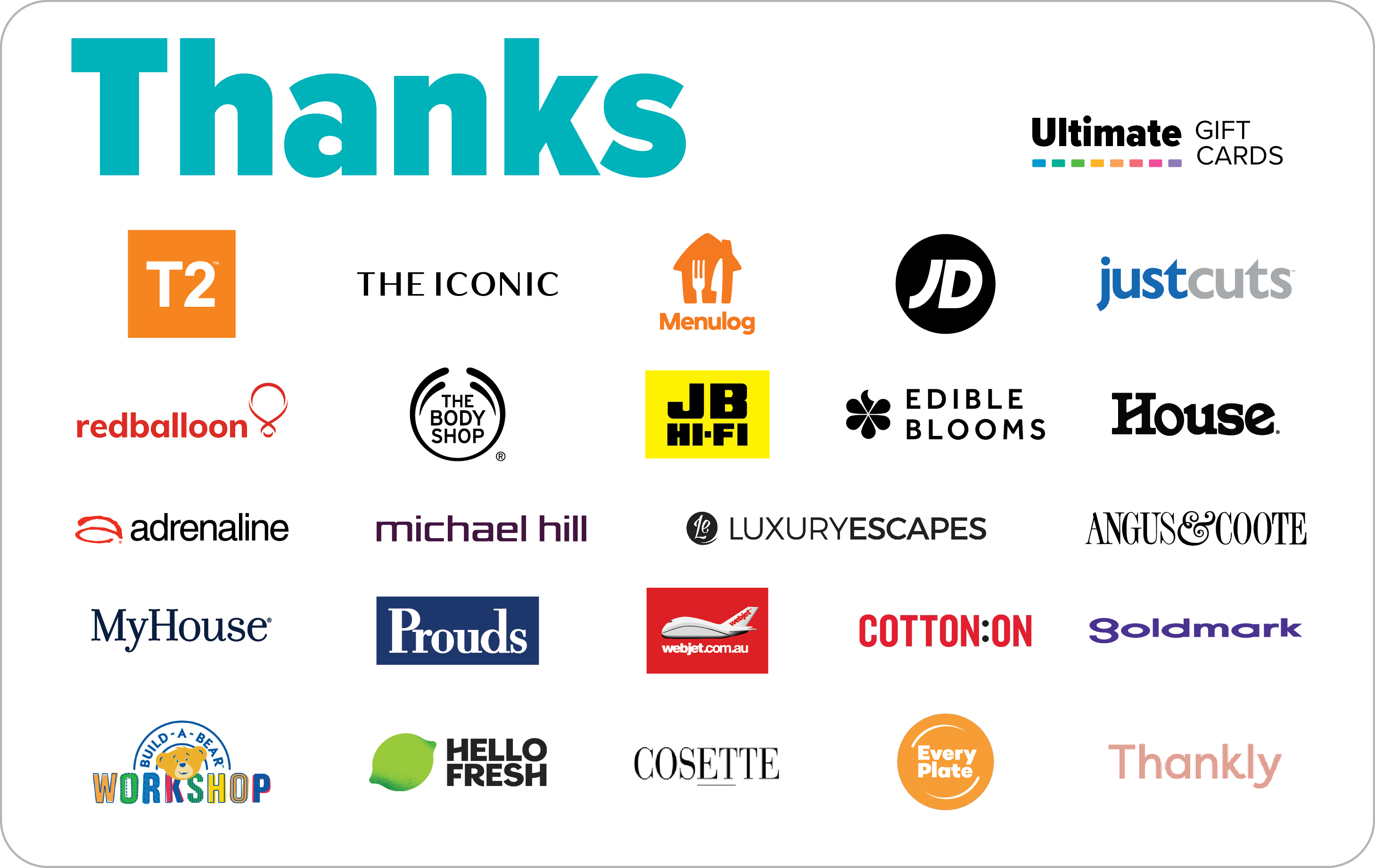 Teens - Ultimate Gift Cards Check Balance Available in the following denominations: $30 $50 $20 to $500 Description The Ultimate Teens Gift Card can be redeemed at Rebel Sport, JB H-FI, Boost Juice, City Beach, Kingpin, Zone Bowling, Timezone, Grill'd & Ripcurl. Ultimate Teens Card cannot be used online, for full terms and conditions click on the T&Cs button below.